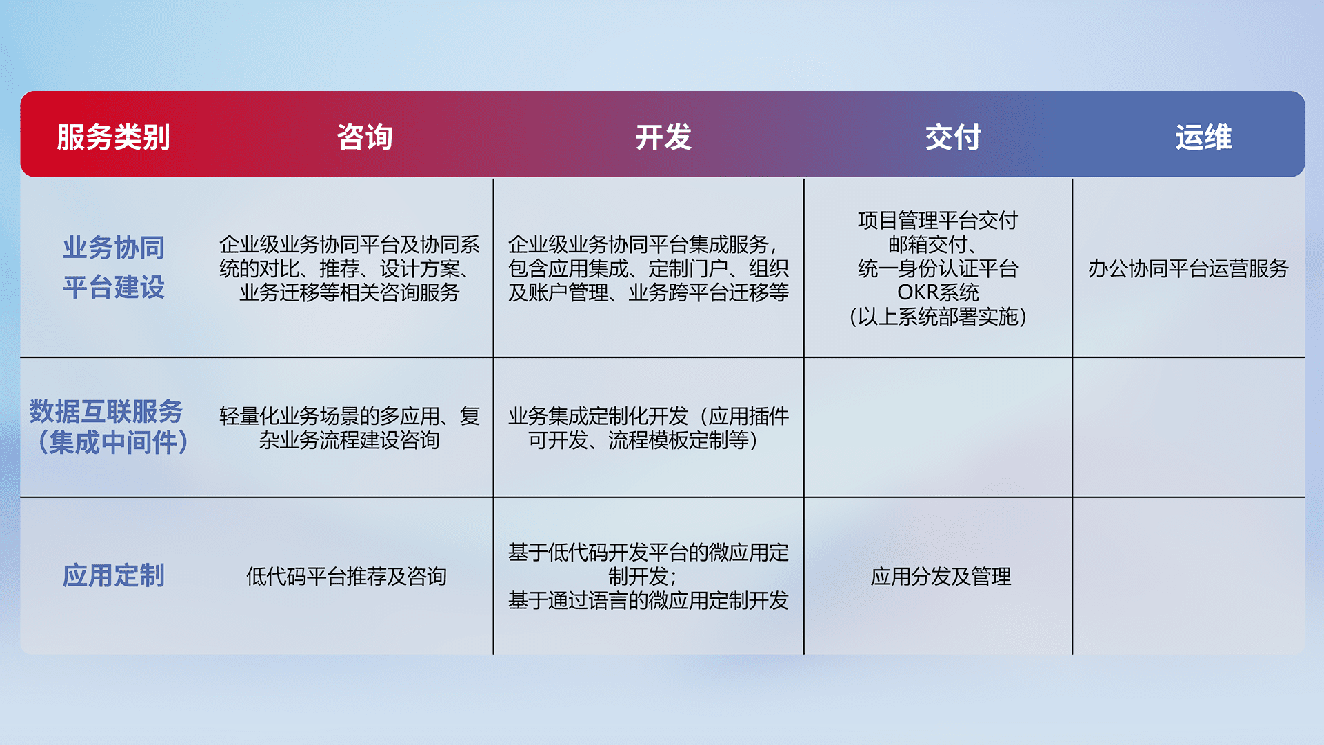 针对钉钉、、企微、、IDaas等平台级产品提供产品的规划、、、方案、、、交付、、、定制化开发等服务,,实现如统一协同办公、、、、智能客户服务、、、混合会议管理、、、、智能数据查询、、、、等业务场景,,,,实现数字化转型。。。